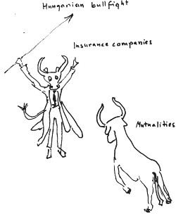 A very strange situation emerged in the Hungarian pension system. Instead of competition, the insurance companies gave support to the foundation of the mutualities (pension funds), at the same time they make them dependent from the bestower insurance company who in contractual form provide them administration, investment etc. According to the Law on the VMBF's, on the private pension funds and the Civil Law this activity is illegal. So the biggest pension funds are in illegal position and could be punished by the supervision. We can compare this situation with a Spanish bullfight, where the toreador symbolised the insurance companies being a strong position against the bull symbolised the mutualities. In the Hungarian bullfight the toreador has a bull-mask and is in an illegal, uncomfortable position.